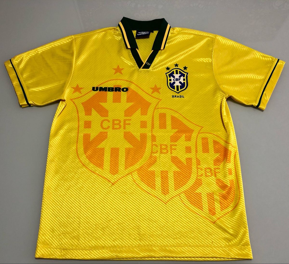Compartilhe: Modelo do uniforme usado pela Seleção Brasileira de Futebol durante a Copa do Mundo de 1994, disputada nos Estados Unidos. Modelo da camisa número 1, amarela, com três distintivos da CBF em relevo no tecido, em homenagem aos, até então três títulos mundiais conquistados.