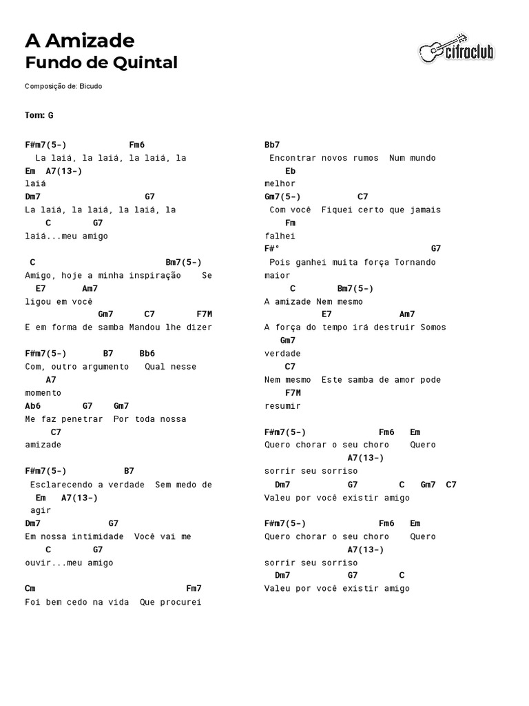 A7(13-) Dm7 G7 C Gm7 C7. F#m7(5-) Fm6 Em. A7(13-) Dm7 G7 C. Aprenda a tocar a cifra de A Amizade (Fundo de Quintal) no Cifra Club. QA amizade / Nem mesmo a força do tempo irá destruir / Somos verdade / Nem mesmo este samba de amor pode nos resumir.
