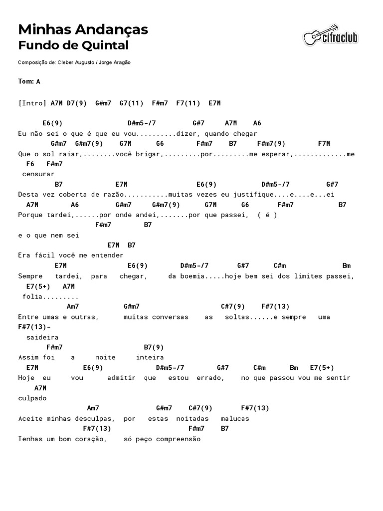 Bm7. Bm7/A E7. Me sorrindo e até pedindo bis. Aprende a tocar el cifrado de Quantas Canções (Fundo de Quintal) en Cifra Club. Ah quantas canções já fiz para esse amor / Dizem que sou louco um tolo sonhador / Canto para alguém que nem se quer vem me escutar / Os acordes do meu violão passean.