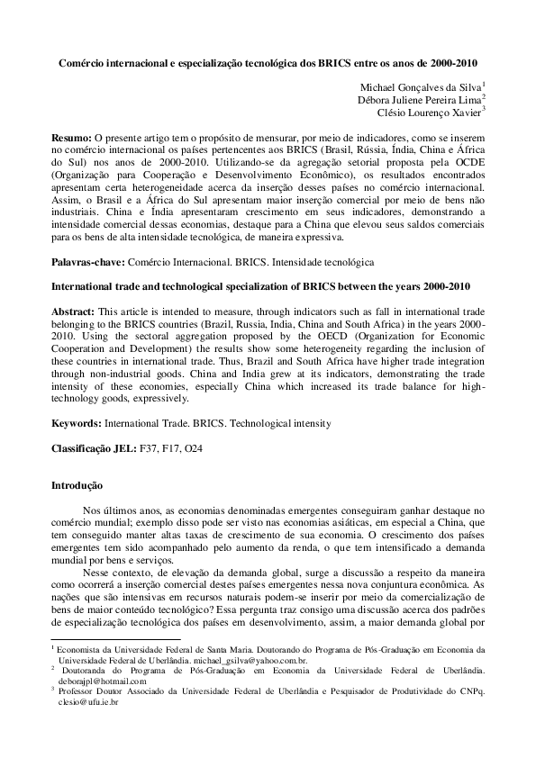 (PDF) Comércio internacional e especialização tecnológica dos BRICS entre os anos de 20002010