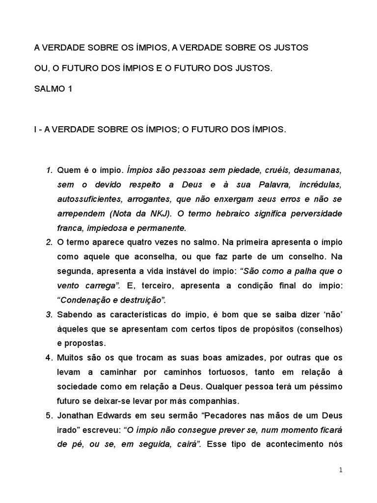 O estado oposto do ímpio apontado, sob o . metáfora da palha levada pelo vento , 4. A miséria dos pecadores e a felicidade final dos . piedoso , 5, 6. NOTAS SOBRE O SALMO I . Verso Salmos 1:1. Abençoado é o homem ] Este salmo não tem título , e geralmente é considerado, mas sem razão especial, como um prefácio ou introdução para.
