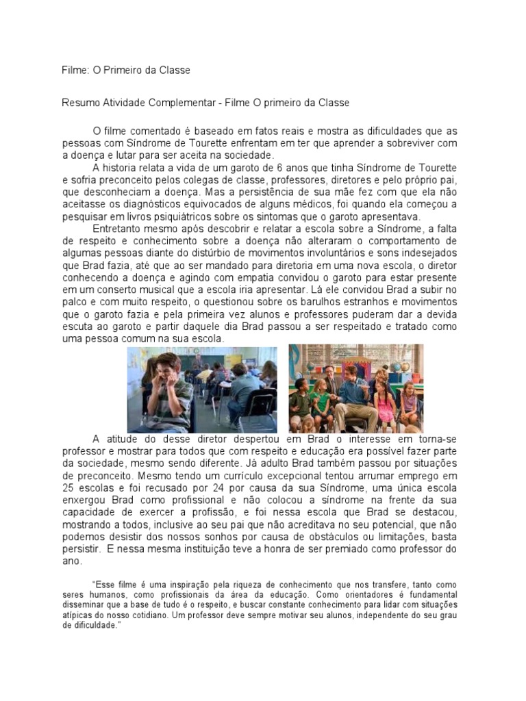 Resumo Do Filme O Primeiro Da Classe Síndrome De Tourette ENSINO