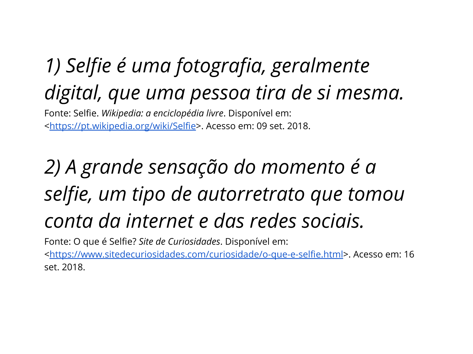 Verbete enciclopédico é um gênero textual de natureza expositiva, encontrado, como o nome já diz, em enciclopédias. Elas são organizadas em verbetes. Eles têm como objetivo apresentar definições e informações sobre um determinado assunto, utilizando linguagem objetiva e impessoal.Análise das imagens acimaComo é possível afirmar que o texto 1 é uma propaganda sobre selfie e o 2.