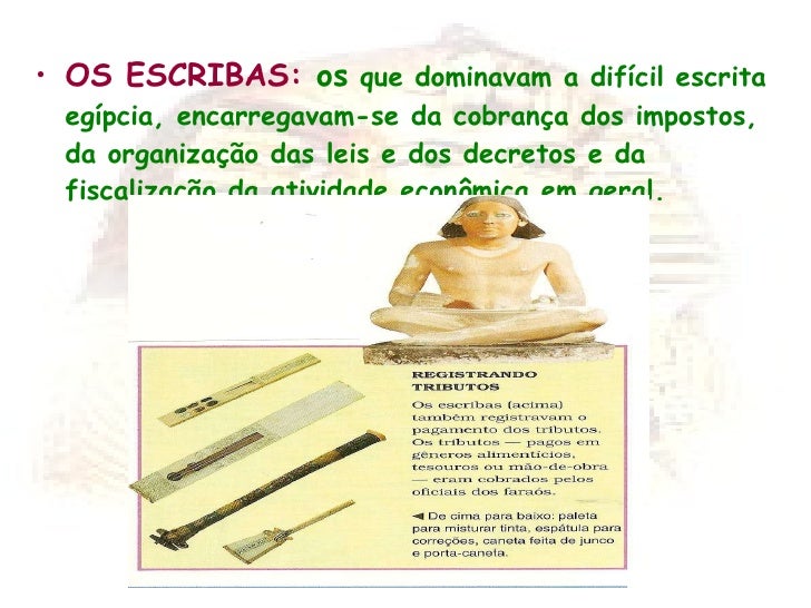 Além disso, muitos escribas tinham uma função religiosa, copiando textos religiosos com exatidão. Onde era preciso alguém que sabia escrever, ali o escriba encontrava trabalho. O que os escribas usavam para registrar os textos. Um escriba precisava de vários materiais de escrita. Na antiguidade não havia lápis, canetas nem papel como.