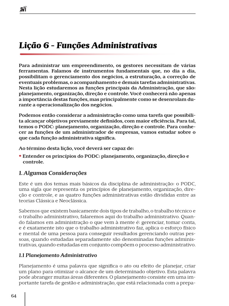 As 4 funções administrativas são: Planejamento, Organização, Direção e Controle ou PODC, sigla pela qual também é conhecida a estrutura. Como você pode perceber, são funções que definem o que você deve executar para ter uma empresa bem administrada. Vamos entender um pouco mais sobre cada uma destas funções: 1. Planejamento.