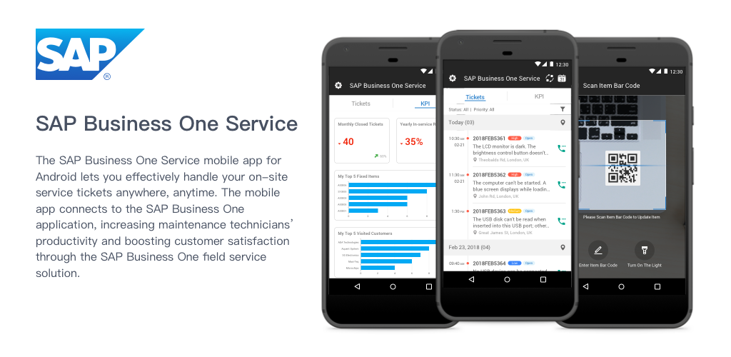 The mobile app lets managers, executives, sales reps, and service techs stay informed about their business, view reports, manage contacts, and handle sales and service activities. Key features of SAP Business One for Android. • Get alerts on events, like deviations of approved prices, credit limits, or targeted gross profits.